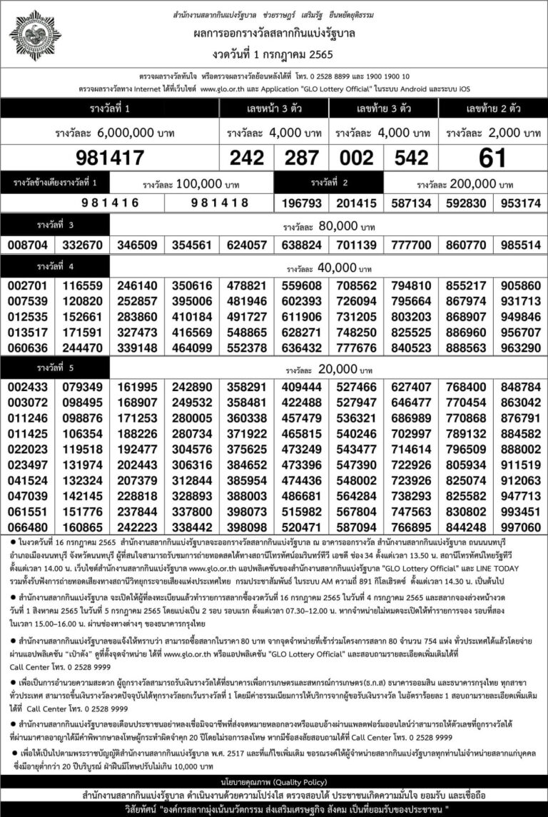 ใบตรวจหวย 1 กรกฏาคม 2565