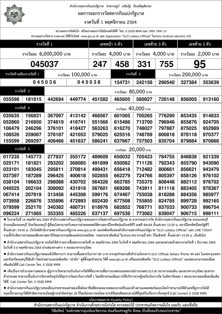 ผลสลากกินแบ่งรัฐบาลงวดประจำวันที่ 1 พฤศจิกายน 2564 ตรวจสลากกินแบ่งรัฐบาล ผลหวย เช็คสลากกรอกตัวเลข ใบตรวจหวย พร้อมสถิติหวยย้อนหลัง ตรวจหวยเร็วๆ ทันใจ