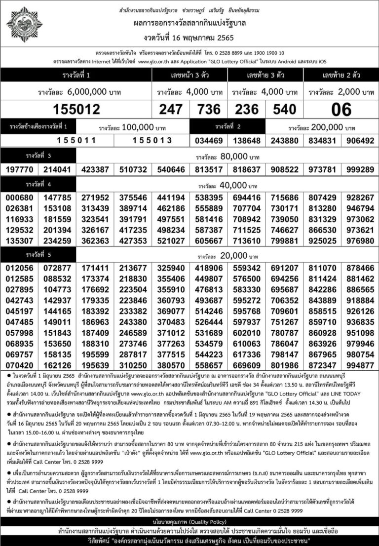 ผลสลากกินแบ่งรัฐบาล งวดประจำวันที่ 16 พฤษภาคม 65 ตรวจสลากกินแบ่งรัฐบาลผลหวย เช็คสลากกรอกตัวเลข ใบตรวจหวย พร้อมสถิติหวยย้อนหลัง ตรวจหวยเร็วๆ ทันใจ
