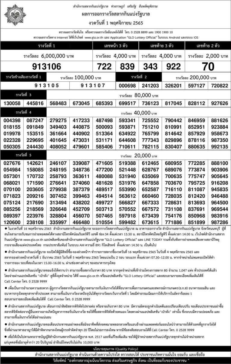 ใบตรวจหวย 1 พฤศจิกายน 2565